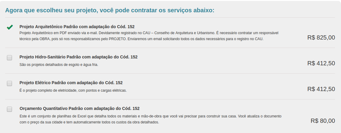 Após a escolha do seu projeto, você pode contratar outros serviços opcionais (projeto ELÉTRICO, projeto HIDRÁULICO e/ou orçamento quantitativo).