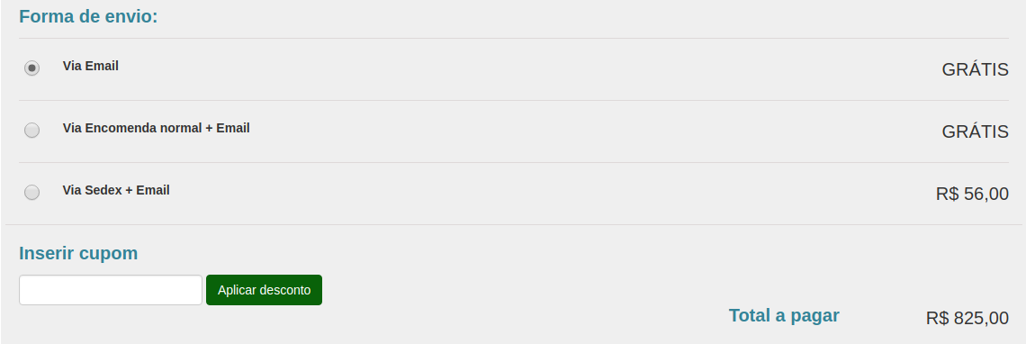 Nesta etapa você escolhe qual a forma de envio você deseja. Seu projeto pode ser enviado por email, encomenda normal ou sedex. Caso você tenha algum cupom promocional, você pode aplicá-lo para obter descontos em sua compra.